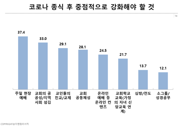 코로나 종식 후에 교회가 중점적으로 강화해야 할 사항들에 대해서 개신교인들에게 물었다.