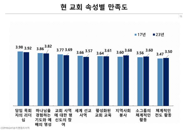 개신교인들에게 속성별로 현 교회에 대해 만족도를 물었을 때, ’담임 목회자의 리더십‘, ’하나님을 경험하는 기도와 예배의 영성‘, ’교회 사역에 대한 평신도의 참여‘ 등의 순으로 현재 만족도를 나타냈다.