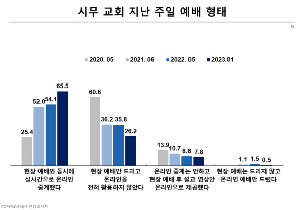 ‘현장 예배/온라인 예배 병행’과 같은 하이브리드 형식의 예배는 코로나19 이후 점차 상승 추세를 보이고 있으며, 반대로 ‘현장예배만’, ‘설교 영상만 제공’, ‘온라인 예배는’ 하락의 추이이다. 즉, 하이브리드 형식의 예배가 점차 한국교회에 자리 잡히고 있음을 보여주고 있다.