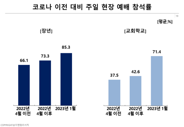 현재 장년 교인 예배 참석률은 85.3%였으며, 교회학교 학생들의 예배 출석률은 71.4%로 나타났다. 특히 교회학교의 현장 예배 참석률이 직전 조사 대비 28.8%p의 상대적으로 높은 상승 폭을 보였다.