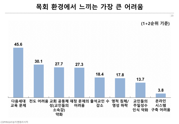 목회자들이 목회 환경에서 느끼는 어려움은 ‘다음세대 교육 문제’가 45.6%로 가장 컸고, ‘전도 어려움’ 30.1%, ‘교회 공동체성’ 27.7%, ‘재정 문제의 어려움’ 27.3% 등의 순으로 나타났다. 다음세대 교육 문제에 대해 일선 목회자들의 고민을 엿볼 수 있는 대목이다.
