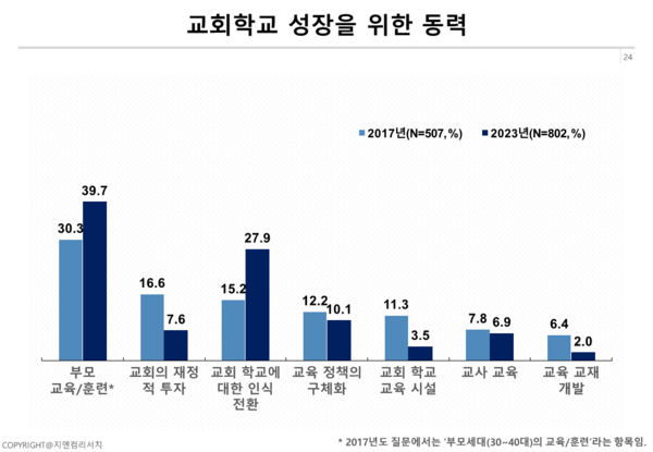 목회자들에게 교회학교 성장을 위한 동력은 무엇이냐고 물었을 때, 첫 번째로 ‘부모 교육/훈련’을 39.7%로 약 5명 중 2명이 응답했다. 이는 2017년 30.3%에서 9.4%p 증가한 것으로 코로나 이후 부모 교육에 대한 목회자들의 인식이 높아졌음을 보여주고 있다.