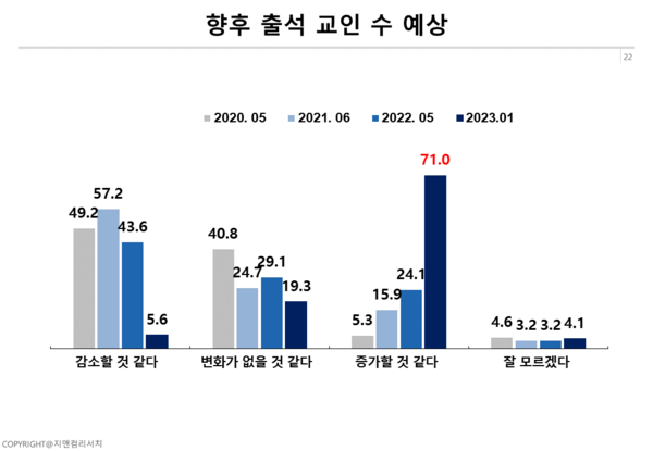 목회자들에게 향후 출석 교인 수를 물었다. ‘증가할 것 같다’가 71.0%로 담임 목사들이 향후 출석 교인 예상에서 낙관적인 전망을 바라보고 있었다.