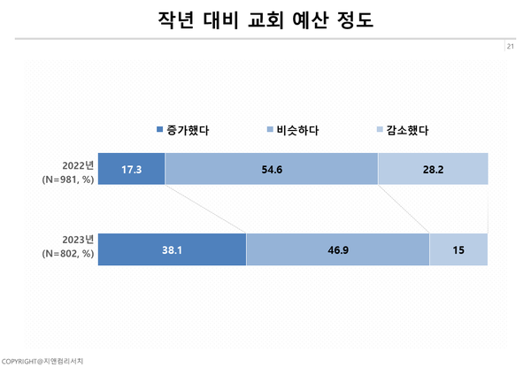 예산이 증가한 비율은 22년과 대비하여 20.8%p 상승하였으며 이는 ’코로나 대비 사역 정도‘에서 ’헌금 수준‘의 회복이 큰 것에 영향이 있다고 판단된다.