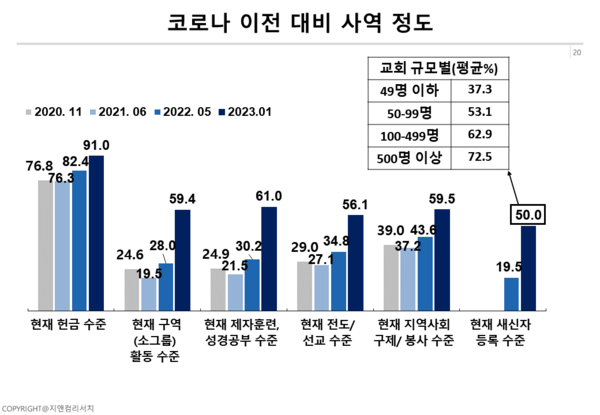 헌금을 제외한 대부분 사역 항목에서 작년보다 크게 회복했으나 아직까지도 50~60% 회복에 그치고 있는 것으로 나타났다.