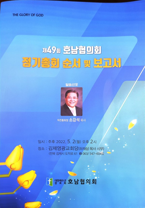 지난 5월 2일 예장합동 호남협의회가 김제영광교회(하재삼 목사)에서 제49회 정기총회를 열어 하재삼 목사를 대표회장으로 추대했다. 하재삼 목사는 “1년동안 대표회장 역할을 잘 감당하도록 하겠다”며 “직전총회장 소강석 목사님의 설교말씀과 격려해주신 목사 장로님들의 귀한 말씀들을 귀담아듣고 협의회 발전과 총회를 섬기는 일에 최선을 다하겠다”고 소감을 밝혔다.