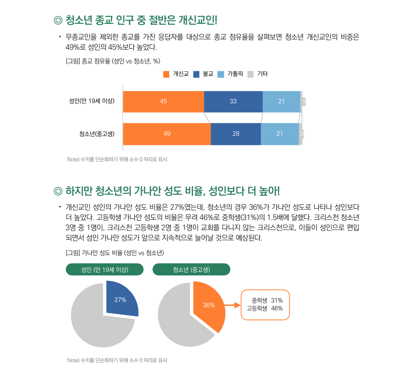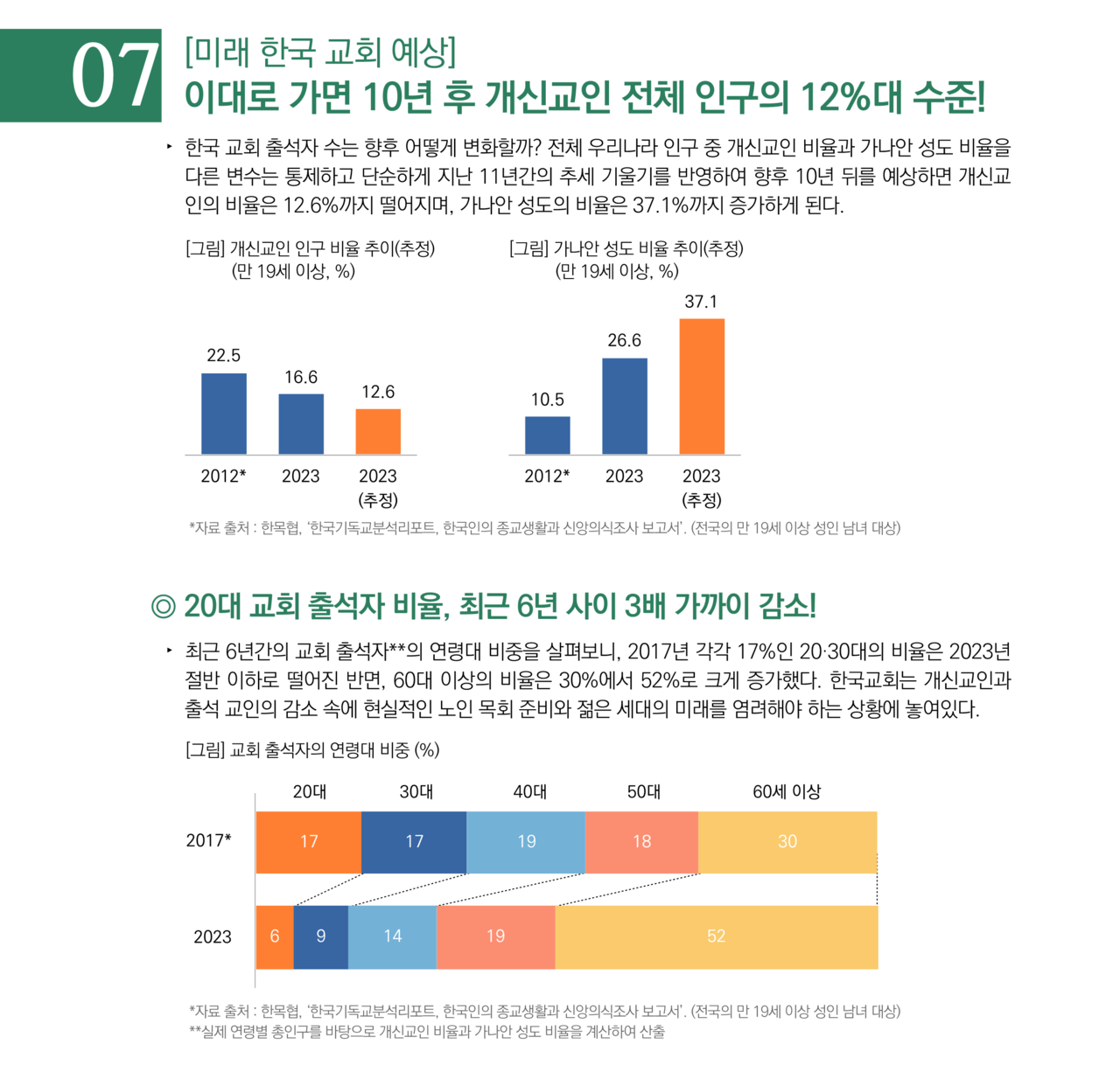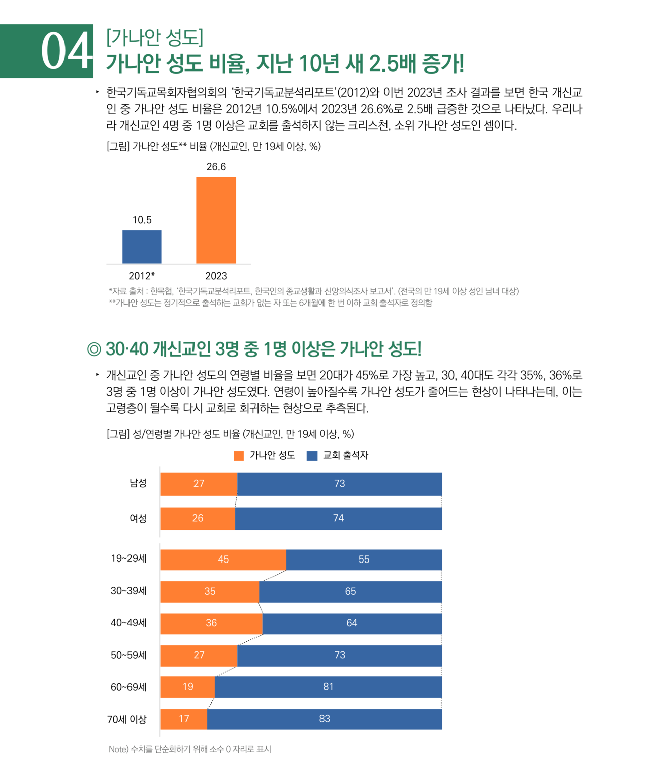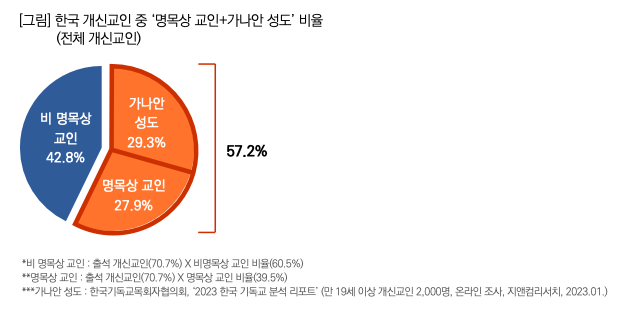 ‣ 한국기독교목회자협의회의 ‘한국 기독교 분석 리포트’에 따르면 2023년 개신교인 중 교회 출석자가 70.7%, 가나안 성도가 29.3%였다. 앞에서 교회 출석자 중 명목상 교인이 39.5%로 나타났는데, 이를 가나안 성도까지 포함한 전체 개신교인을 기준으로 하면 27.9%가 된다. 따라서 ‘가나안 성도’와 ‘명목상 교인’을 합하면 전체 한국 개신교인의 57.2%에 달하는 것으로 조사됐다.