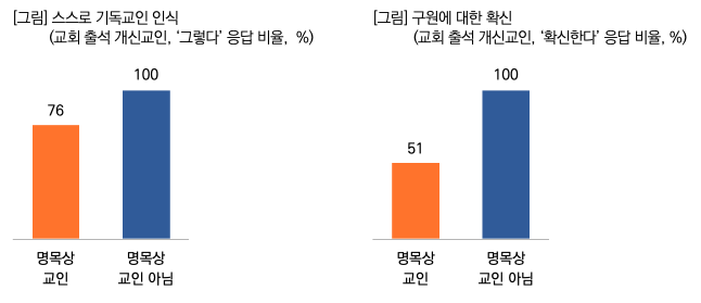 ‣ 다만, ‘하나님을 떠난 인간은 죄인이다’에 대해서는 절반가량만 동의했고, ‘기독교 외 타 종교에 구원이 없다’에는 명목상 교인 10명 중 4명(38%)만 ‘그렇다’고 응답해 나머지 10명 중 6명(62%)은 ‘기독교에만 구원이 있다’는 신앙적 명제에 대해 확신이 없는 것으로 나타났다.