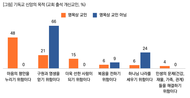 ‣ 기독교를 믿는 목적이 무엇인가를 물은 결과, ‘명목상 교인’은 ‘마음의 평안’(48%)을 꼽은 비율이 다른 본질적인 이유보다 압도적으로 높았다. ‘비 명목상 교인’은 3명 중 2명이 ‘구원과 영생을 얻기 위함’이라고 응답한 것과는 인식의 차이가 컸다.