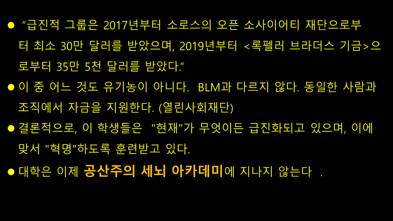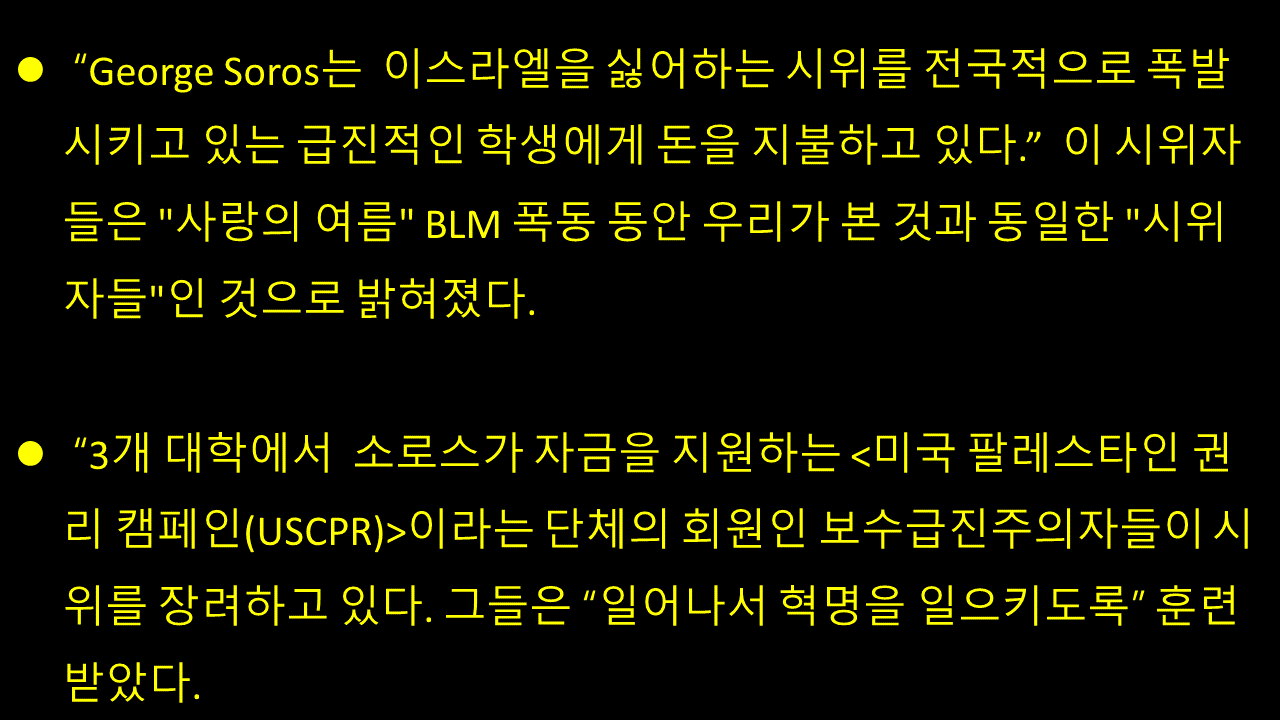 그 보도에 의하면 평화를 위한 유대인의 소리와 이프낫나우가 콜럼비아 대학교와 기타 다른 대학교에서 반유대 데모하는 조직의 배후라고 했습니다. 그들 조직은 타이즈 재단의 후원을 받고 있는데 이들은 실질적으로 소로스로부터 펀드를 받고 있으며 빌과 멜린다 게이츠 재단으로 부터도 자금지원을 받고 있습니다. 그리고 그들은 좌익단체에 자금을 나누어 주고 있습니다.