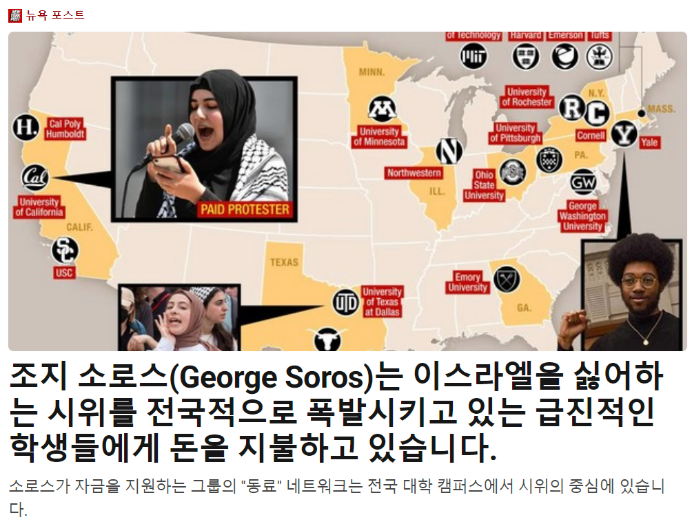 현재 미국의 대학교 캠퍼스를 점령하고 있는 반유대주의 데모대들을 재정적으로 지원하고 있는 큰 손들이 누구인지 밝혀졌습니다. 정치 월간지 폴리티코에 의하면 바이든 재선을 뒤에서 지원하고 있는 민주당 큰 손 후원자들이라고 했습니다.