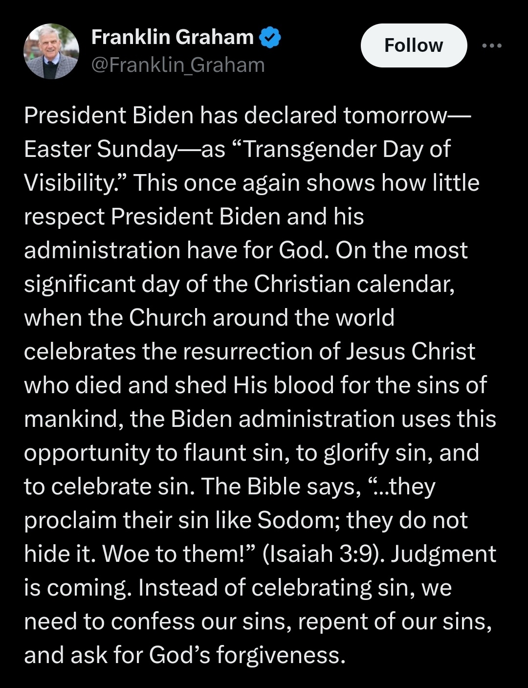 필자는 위의 두 가지 의견 중 전자 보다는 후자에 방점을 찍고 싶다. 어제 빌리 그래험 목사의 아들인 빌리 그래험 재단의 프랭클린 그래험 목사가 이러한 모든 의견들과 반론들을 함축적으로 표현한 글을 올렸기에 번역하여 여러분들에게 알린다. 그리고 아래에 프랭클린 그래험 목사가 쏘셜 미디어 X에 올린 원문도 첨부한다.
