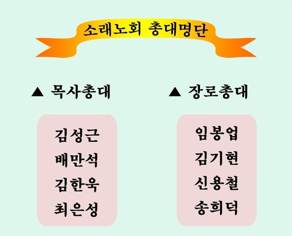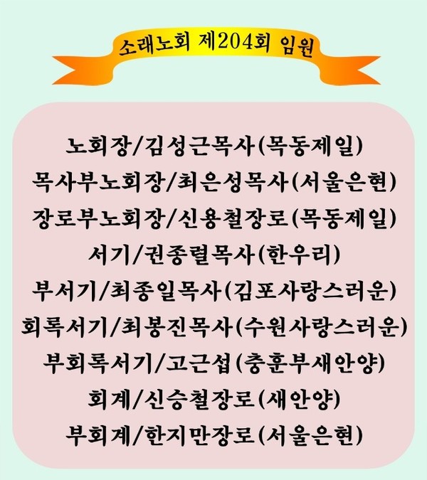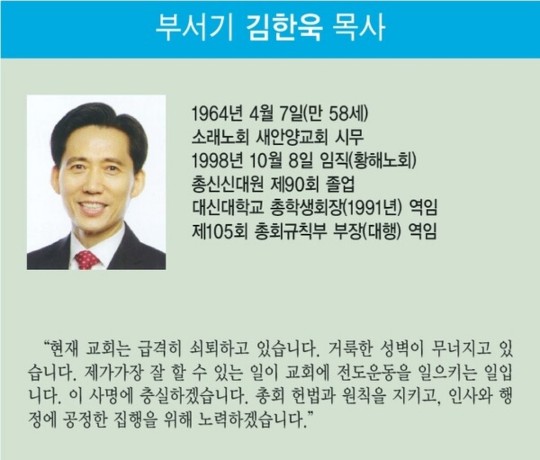 한편 지난 4월 13일 오전 10시에 수원명성교회에서 개최된 소래노회에서 현 총회 부서기 김한욱 목사를 제108회 총회 임원 서기후보로 만장일치 기립박수로 추천하였다.