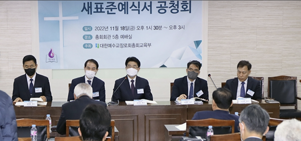 교육부는 지난해 11월 18일 총회회관에서 ‘제107회기 새표준예식서 공청회’를 열었다. 윤영민 집필위원장은 “개혁주의 ‘신학’과 장로교 ‘전통’에 맞으면서도 교회에 꼭 필요한 ‘목회실천적’ 예식서를 만들고자 노력했다. 시시각각 세상이 바뀌는데 여전히 30년 전 표준예식서를 사용하는 것이 안타까웠다. 포스트모던, 4차 산업혁명, 팬데믹 등 시대 변화를 반영한 만큼, 목회자들의 예배 인도에 도움이 되기를 바란다고 설명했다.