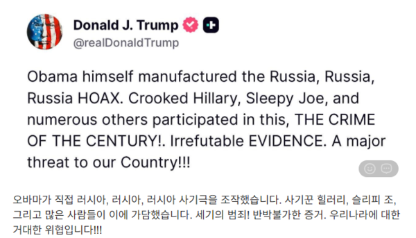 또한 트럼프 대통령은 지난 2025년 7월 23일 "버락 후세인 오바마가 주모자입니다. 힐러리 클린턴도 그자리에 함께 있었고 슬리피 조 바이든도 마찬가지였고 나머지 사람들도 마찬가지였습니다. 코미, 클래퍼, 전체 그룹. 그들은 선거를 조작하는 데 지쳤고 결국 잡혔습니다."라고 말하며, 오바마 반역죄를 공개적으로선언했다.