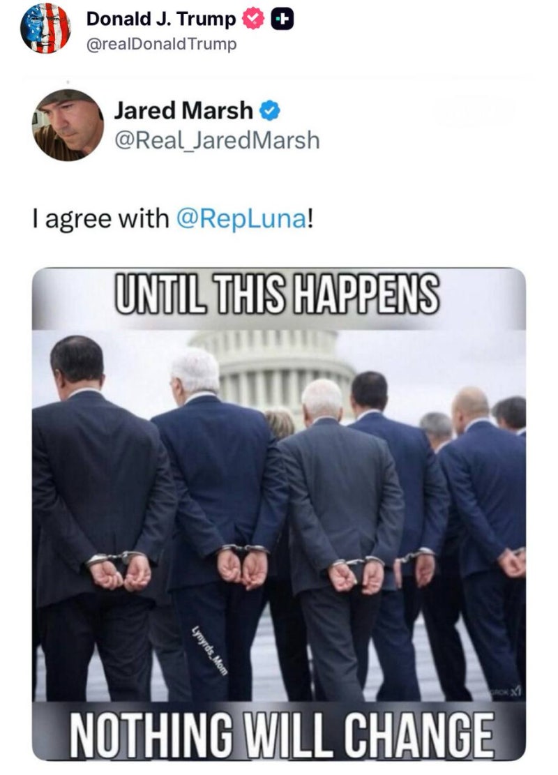 최근 트럼프는 '반역자들이 전부 체포될 때까지는 아무것도 달라지지 않는다'는 의미심장한 포스트를 올렸다. 전 세계적으로 적어도 50만명 정도는 체포된다고 한다. 그 50만 명 중에 우리나라는 체포자 수가 얼마나 될까? 이미 한국에는 트럼프의 직속부대라고 할 수 있는 우주군이 평택에 와 있다. 그들의 임무는 무엇일까? 공은 닦은 대로 가지만, 죄는 지은 대로 받아야 하는 것이 우주의 법칙이다.