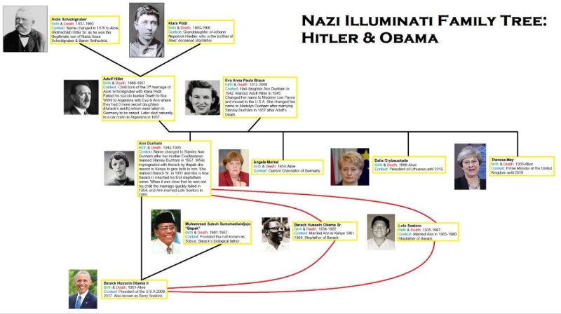 상기 사진에 히틀러의 가계가 잘 표시되어 있다. 오바마는 히틀러의 외손자였던 것이다.독일 총리 메르겔은 둘째 딸이었다.