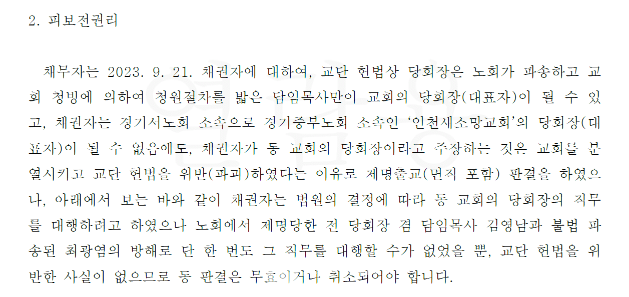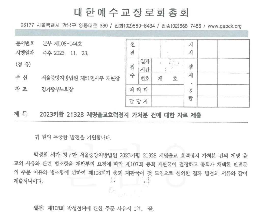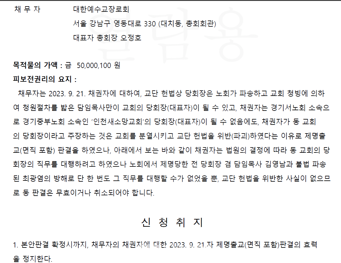 그러자 면직당한 당사자는 지난 10월 13일 서울지방법원에 총회(총회장)을 채무자로 하여 제명출교판결 효력정지 가처분 신청을 했다.