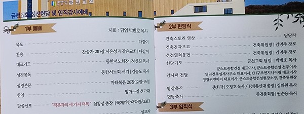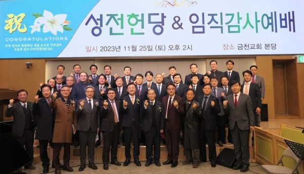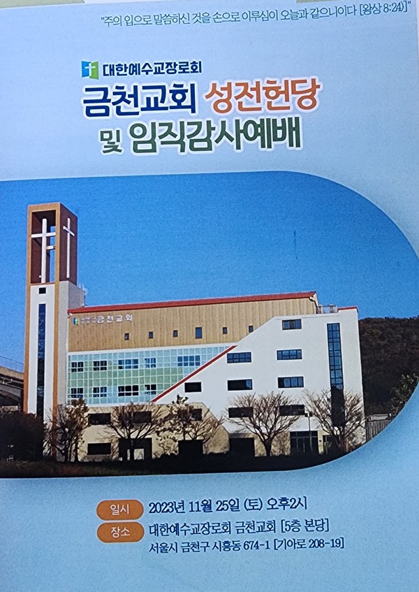 지난 2023년 11월 25일 오후 2시 예장합동(총회장 오정호 목사) 동한서노회(노회장 정신길 목사) 소속 금천교회(박병호 목사)가 안양천변으로 건물을 구입하여 이전하면서 리모델링 하여 버젓한 교회를 헌당하면서 임직감사예배를 겸하는 잔치를 벌였다. 오정호 총회장은 이 소식을 듣고 요즘에 이렇게 교회를 새로 헌당하면서 대규모 임직식을 하기가 어려운데, 참으로 놀랍다고 말했다. 그리고 축하 영상을 보냈다.