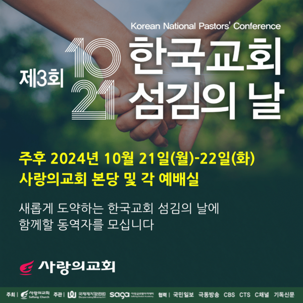 사랑의교회가 섬기는 제3회 10.21 한국교회 섬김의 날은 한국 교회 목회자, 사모, 선교사, 신대원생 등이 10월 21일 22일 양일간 사랑의교회에 모여 함께 부르짖어 기도하며 하나님의 신적개입을 갈구하는 기도와 말씀의 잔치로 자리 매김하고 있습니다.