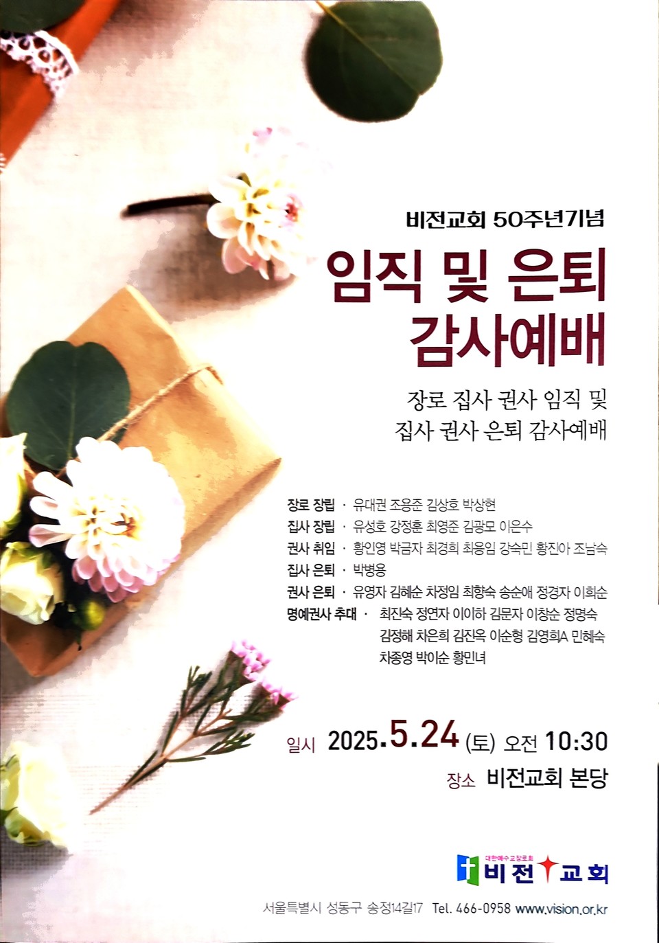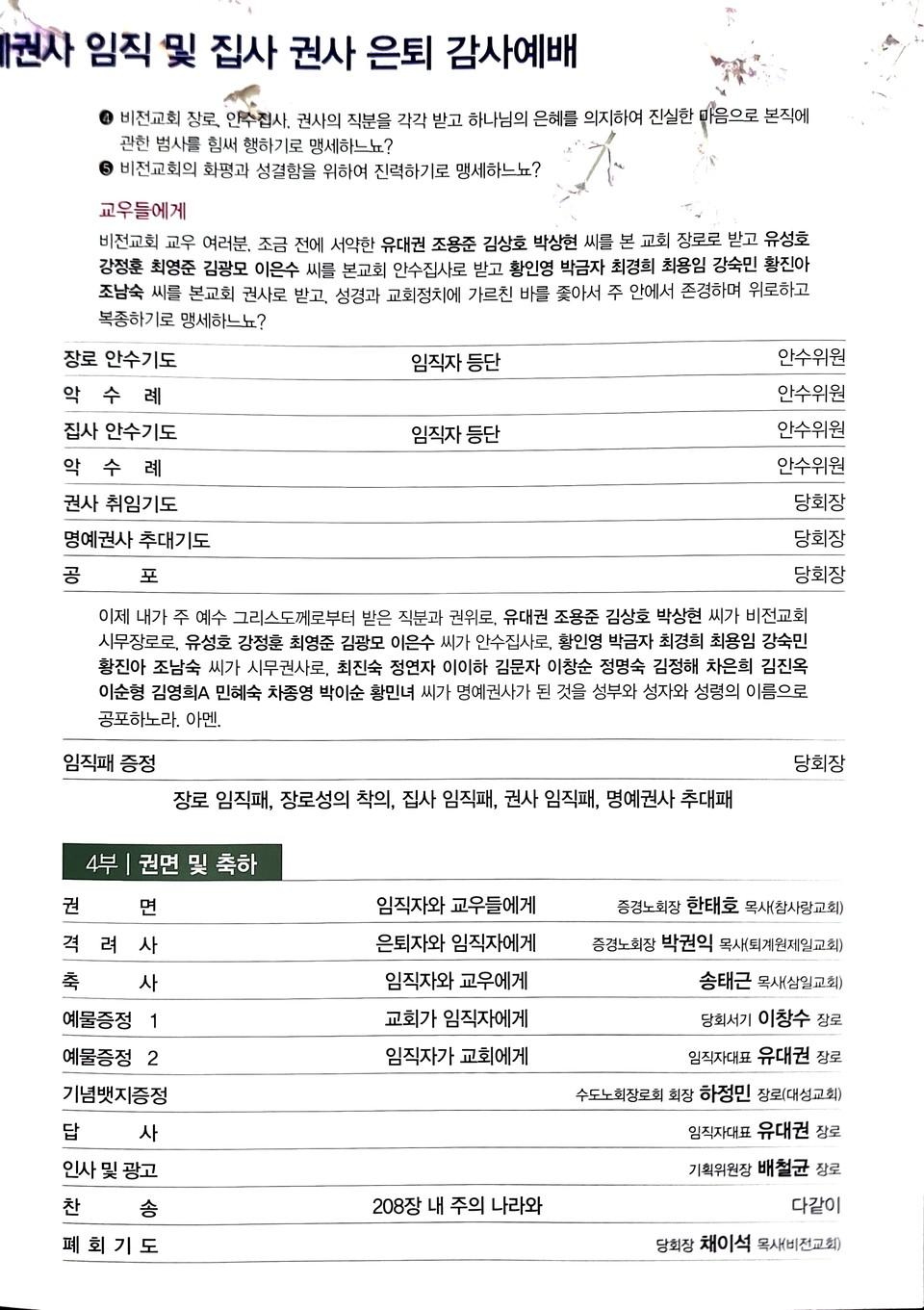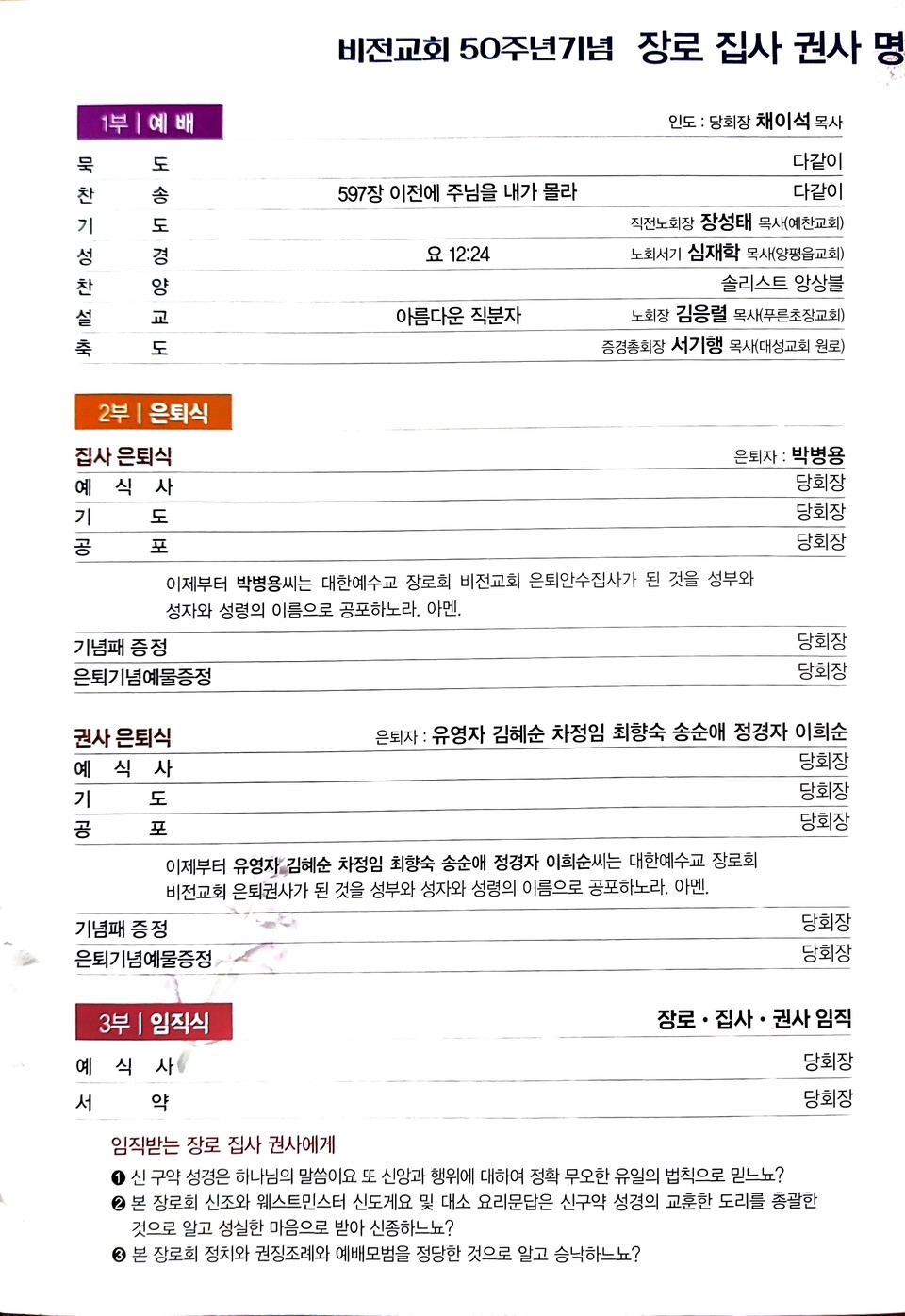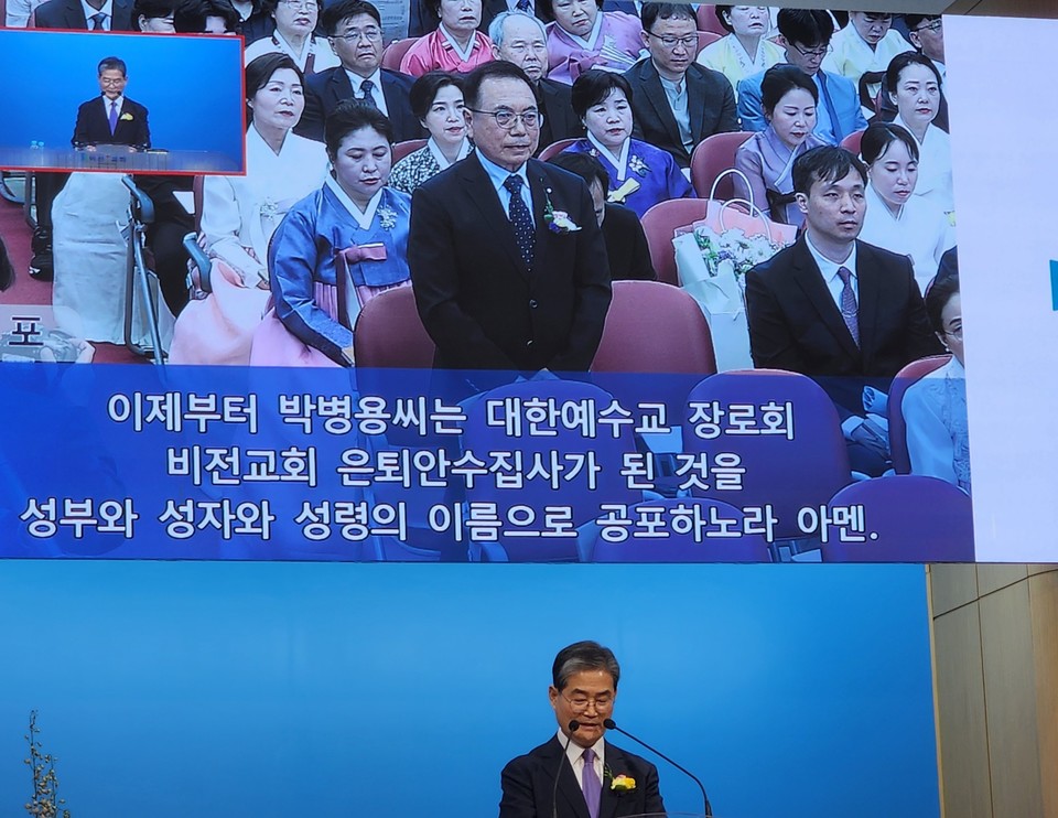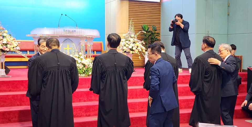 채이석 비전교회 담임목사 축사를 맡은 송태근 목사 장성태 직전노회장 기도 김상윤 신웅철 장로 백양선 장로 솔리스트 앙상블 특송 김응렬 노회장 설교 축도 서기행 증경총회장 박병용 은퇴 안수집사 임직자들 임직자들 사회자 귄사은퇴 교인선서 장로장립 안수기도 권면하는 한태호 목사 <저작권자 © 리폼드투데이 무단전재 및 재배포금지> 관련기사 【故 한기승 목사】빈소 조문 현장 【빌라도 보고서】기독교의 핵심을 흔드는 충격적인 계시 【사랑의교회】‘Heal Our Nation 나라 사랑 구국 금식 기도회’ 선포 키워드 #비전교회 #채이석 리폼드 투데이 webmaster@reformedtoday.net 다른기사 보기 저작권자 © 리폼드투데이 무단전재 및 재배포 금지 당신만 안 본 뉴스 【헌법개정안】의결정족수에 대한 총회임원회 결정 【교회이탈】떠나는 이유 5가지 【한국교회】신뢰도 19%, 교회괴사증후군 【정년시리즈3】정년 연장을 주장하는 논리 리폼드투데이 주간신문 25호 발간 【총회뉴스】2026년 3월 24일 한기영 목사, 동전주노회서 총무 예비후보 추천 【헌법개정안】의결정족수에 대한 총회임원회 결정 주요기사 【총회뉴스】4월 2일 재경충청장로회 정기총회 리폼드투데이 주간신문 25호 발간 【총회뉴스】2026년 3월 24일 한기영 목사, 동전주노회서 총무 예비후보 추천 【신학논단】그리스도인의 부활체 小考