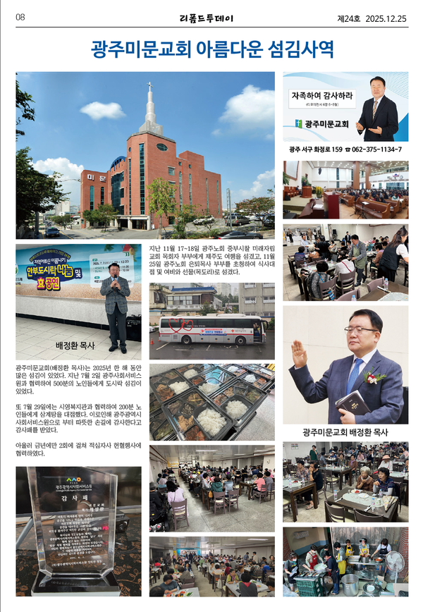광주미문교회(배정환 목사)는 2025년 한 해 동안 많은 섬김이 있었다. 지난 7월 2일 광주사회서비스원과 협력하여 500분의 노인들에게 도시락 섬김이 있었다.
