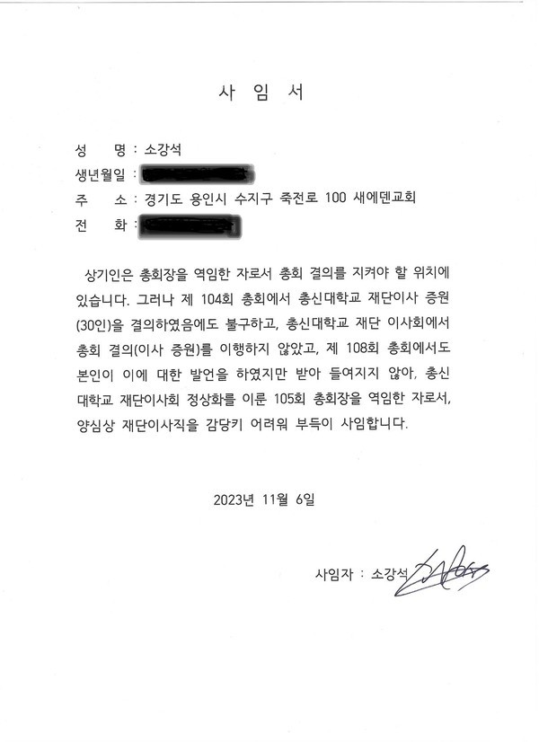 소강석 목사(새에덴교회)가 지난 11월 6일 총신대학교 재단사무국에 이사직 사임서를 제출했다. 총신재 재단이사는 재단사무국에 사임서가 도착하는 즉시로 이사직 사임이 처리된다. 인편 우편 등 여러가지 방법이 있는데, 아마도 팩스를 통해 사임서를 제출한 것으로 보여진다.