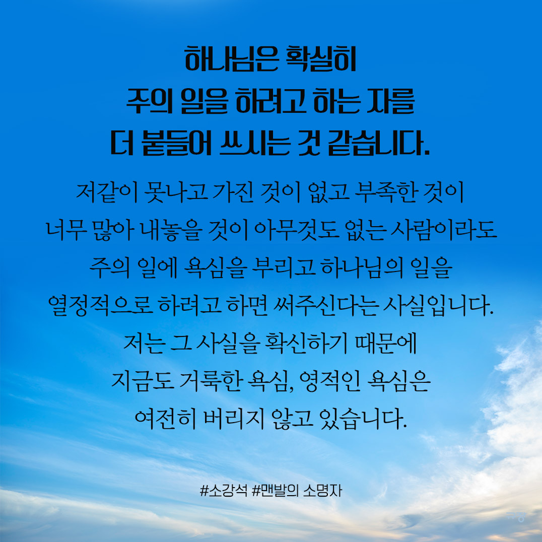 저같이 못나고 가진 것이 없고 부족한 것이 너무 많아 내놓을 것이 아무것도 없는 사람이라도 주의 일에 욕심을 부리고 하나님의 일을 열정적으로 하려고 하면 써주신다는 사실입니다. 저는 그 사실을 확신하기 때문에 지금도 거룩한 욕심, 영적인 욕심은 여전히 버리지 않고 있습니다.