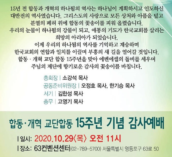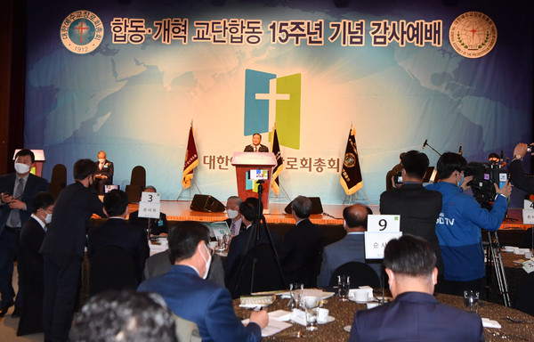 합동-개혁 교단합동 15주년을 맞이하여 지난 2020년 10월 29일 여의도 63빌딩에서 기념 감사예배를 드렸다. 총회임원을 비롯해 증경총회장, 산하 기관장, 총회실행위원 등 교단 주요 인사들과 한교총 대표회장, 각 교단 총회장 및 사무총장 등 교계 인사와 교계 단체장과 언론사 대표 등도 참석했다.