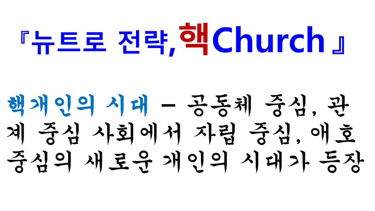 저자는 “핵개인의 시대”에도 목회자는 옥시토시 하트를 가지고 생명력으로 승부를 걸면 된다고 주장한다. 예배와 설교는 정형화를 벗어나고 핵개인의 트렌드를 덮어버리고 이겨야 한다는 것이다. 이를 위해서는 “극화적인 설교, 생명이 넘치는 설교, 남을 사랑할 수 있도록 하는 감정뿐만 아니라 용기를 갖도록 하는 옥시토신 하트를 가져야 한다. 목회자의 사즉생의 결단은 성도들이 감동한다. 핵크리스천이 감동하면 스스로 예수 그리스도 안에서 협력 가족을 이루고 동친 그룹을 이루고 부족공동체를 이루게 된다.”는 것이다.