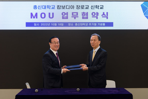 총신대학교(총장 이재서)는 9월 18일 캄보디아 장로교 신학교와 업무협약을 체결하고, 선교적 차원에서 목회자 및 교회지도자를 양성하는 목표를 위해 협력하기로 하였다. 이날 개최된 업무협약 체결식에는 총신대학교 이재서 총장과 캄보디아 장로교 신학교 김재호 총장 등 주요 관계자가 참석했다.