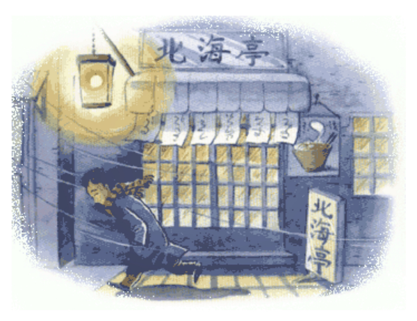 “네엣! 우동 일인분.” 라고 주인은 대답하면서 막 꺼버린 화덕에 불을 붙인다.