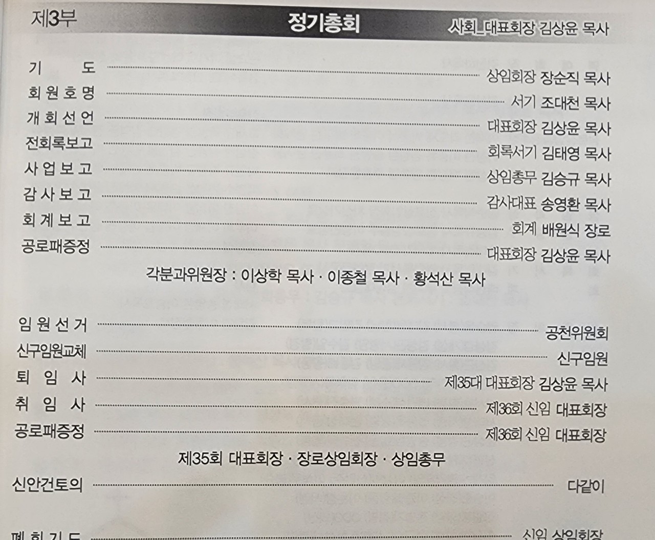제35대 대표회장 김상윤 목사가 “하나님께서 우리에게 허락하신 시간 속에 우리가 결정해야 하는 순간의 기회, 기회의 시간인 ‘카이로스’를 게으름, 안일함으로 놓치지 않았는지 두렵다. 많이 협력해 주셔서 감사하다. 더 발전하는 연합회가 되기를 바란다고” 퇴임인사를 했다. 이어서 36회 신임대표회장 장순직 목사는 “이번 회기에 서북노회협의회 단합을 위해 수련회를 하겠다”고 인사했다.