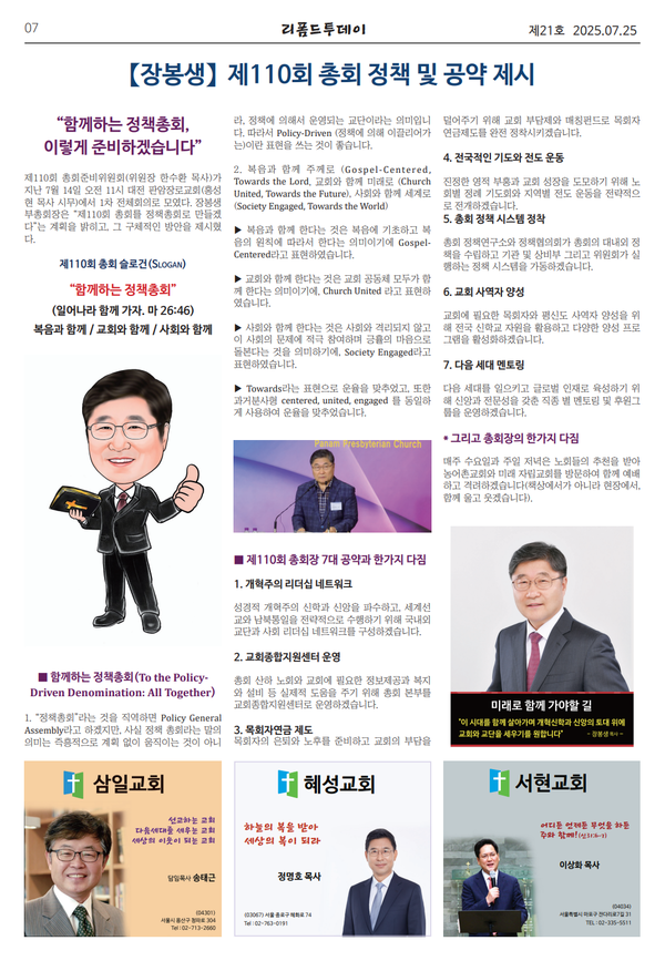 총회 산하 노회와 교회에 필요한 정보제공과 복지와 설비 등 실제적 도움을 주기 위해 총회 본부를 교회종합지원센터로 운영하겠습니다.