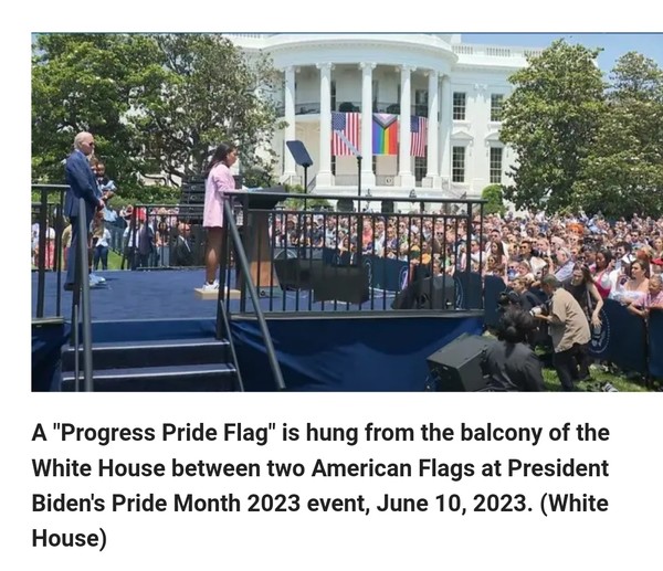 백악관 발코니에는 좌우에 성조기의 호위를 받으며 동성애 깃발이 펄럭이고 있었다.(역자 주: 미국의 가치보다는 LGBTQ의 가치가 우위라는 상징적인 표현)