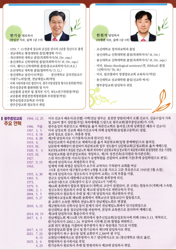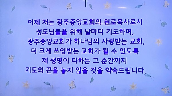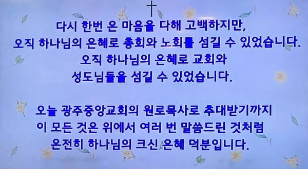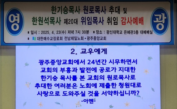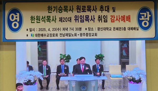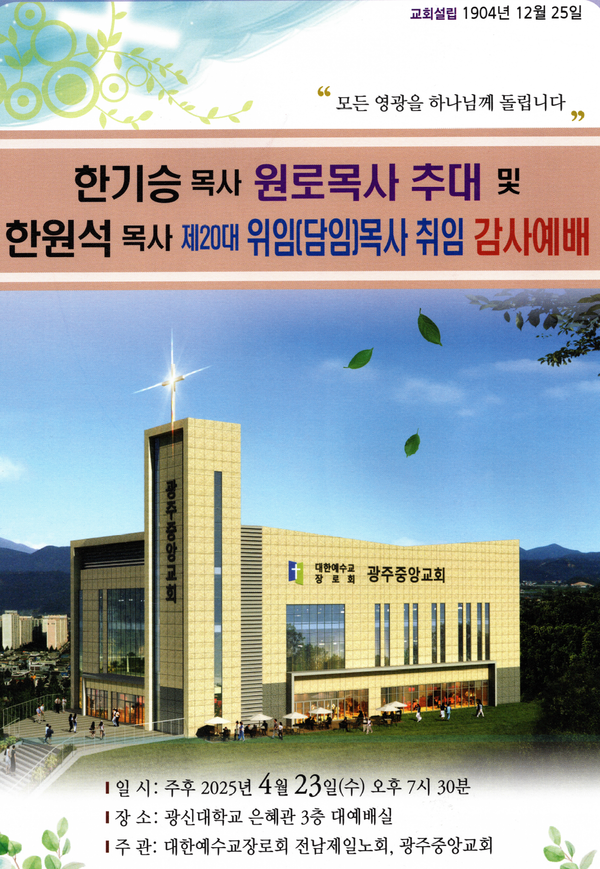 지난 4월 23일 광주중앙교회 한원석 담임목사 위임식은 전남제일노회 위임국장 김광현 목사의 사회로 전남제일노회장 김은식 목사의 서약과 증경노회장 강민수 목사의 위임기도, 위임국장 김광현 목사의 공포로 진행되었다.