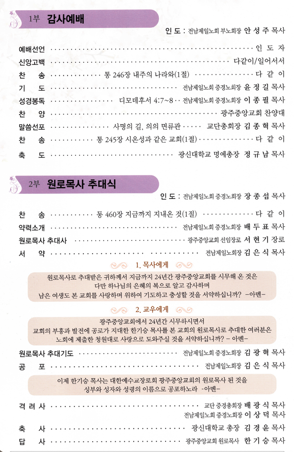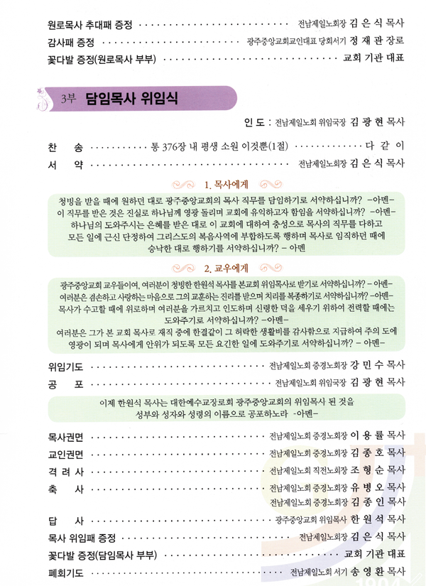 아울러 증경노회장 이용률 목사의 목사 권면, 증경노회장 김종호 목사의 교인 권면, 직전노회장 조형순 목사의 격려사, 증경노회장 유병오 목사, 증경노회장 김종인 목사의 축사, 광주중앙교회 신임 위임 한원석 목사의 답사, 노회장 김은식 목사의 목사 위임패 증정, 위임 목사 부부에 대한 교회 기관 대표의 꽃다발 증정, 교회 광고, 전남제일노회 서기 송영환 목사의 폐회기도의 순서로 은헤롭게 진행되었다.