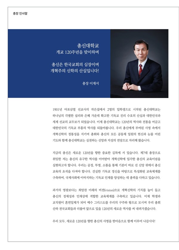 오는 5월 15일, 총신대학교(총장 이재서)가 개교 120주년을 맞이한다. 대한예수교장로회 총회의 직영신학교로서 총신대학교는 교단의 목회자와 기독교 지도자를 양성하는 신학교로서 올해로 120주년을 맞이했다. 1901년 평양의 마포삼열 선교사의 작은 집에서 2명의 학생으로 시작된 평양장로회신학교는 120년의 역사를 이어 오늘날 세계 최대의 단일교단 신학교인 총신대학교로 성장하였다. 개혁주의적 기독교 신앙을 바탕으로 주님의 참된 목회자와 교회와 이웃을 섬기는 실천적 인재를 양성하기 위해 지난 120년간 힘차게 달려왔다.