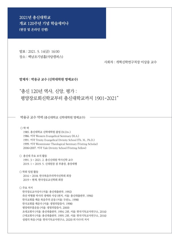 이어서 진행되는 학술세미나에서는 개교 120주년을 맞아 한국교회 개혁주의의 신학적 전통을 회고하고, 21세기 개혁의 신학의 방향을 제시하기 위해 총신대학교 신학대학원 박용규 명예교수가 ‘총신 120년 역사, 신앙, 평가 : 평양장로회신학교부터 총신대학교까지 1901-2021’이라는 주제로 발제한다.
