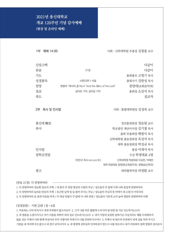 먼저 개교기념일 전날인 5월 14일에는 감사예배와 학술세미나, 감사음악회를 연이어 개최한다. 먼저 오는 14일 오후 2시 열리는 개교 120주년 기념 감사예배는 총회와 법인 학교, 학생들이 하나가 되어 드리는 예배로 드려진다.