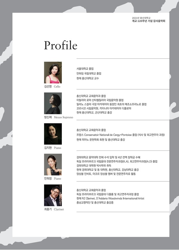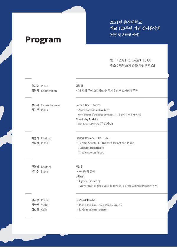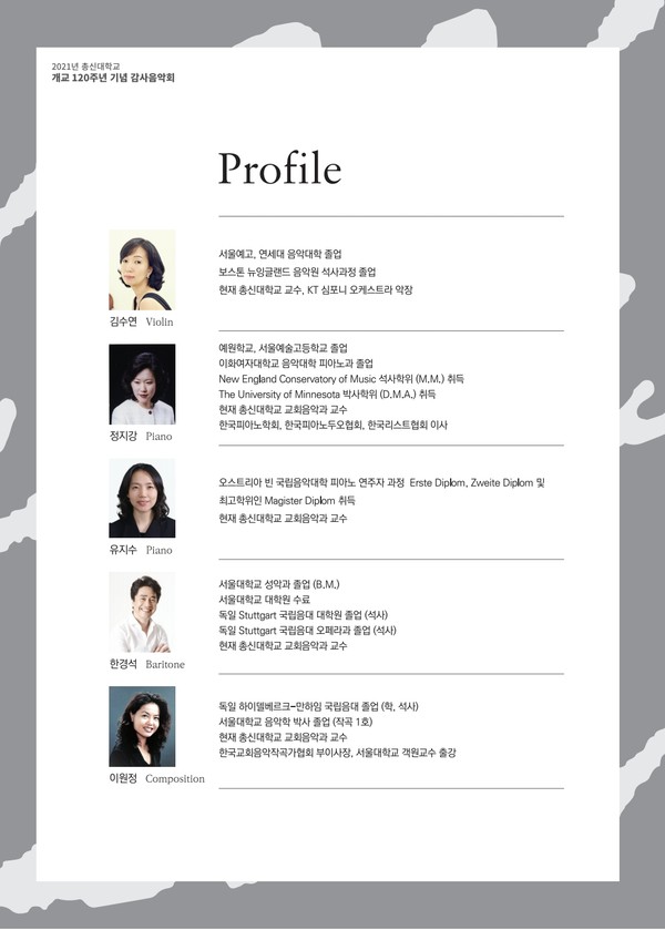 마지막으로 총신대학교 교회음악과 교수들의 재능기부로 이뤄지는 개교 120주년 축하와 감사의 무대를 선사하는 감사음악회가 열린다. 총신대가 자랑하는 피아니스트 정지강 교수, 유지수 교수, 바이올리니스트 김수연 교수, 성악가 한경석 교수, 첼리스트 김선영 교수, 작곡가 이원정 교수 등이 멋진 무대를 펼칠 계획이다.