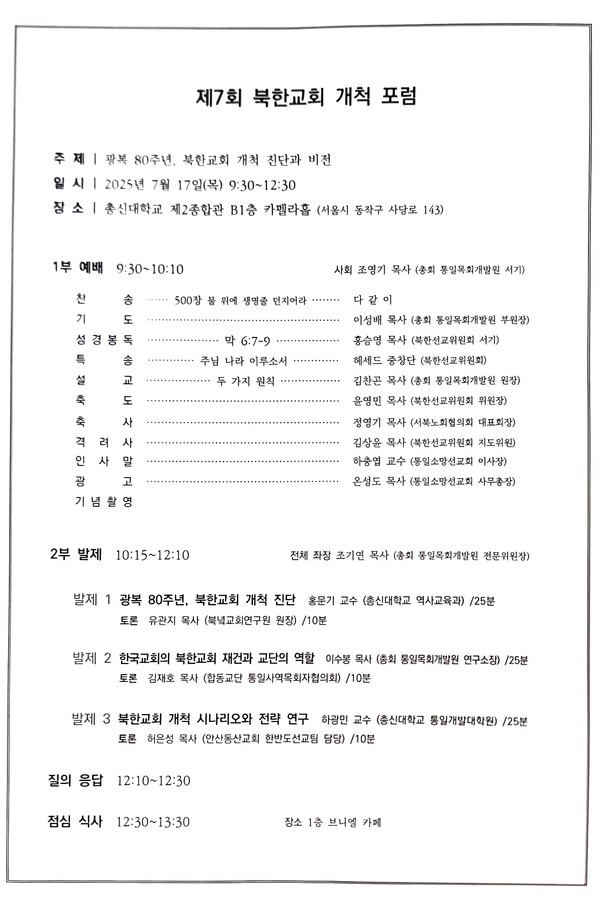 서북협의회 북한선교위원회가 총회 통일목회개발원 및 통일소망선교회와 공동주관하는 제7회 북한교회 개척포럼이 지난 2025년 7월 17일 오전 9시30분부터 총신대학교에서 개최되었다.