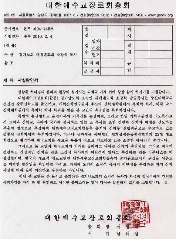 또한 총회임원회는 그가 “이단 규정 권한이 없는 사설단체가 과거 소강석 총회장을 상대로 터무니없이 억지 제기한 이단성에 대해 총회와 한국교회 연합기관에서 전혀 문제가 없다는 결론이 난 사안을 갖고 문제제기를 하고 있다”며 “오히려 문제제기 당사자의 신학과 사상에 대해 깊이 의심하고 우려한다는 총회의 사실확인서(본부 제94-448호)가 있음을 상기하고, 지금까지의 행동에 대해 공개적으로 총회와 총회장에게 사과할 것”을 촉구키로 했다.