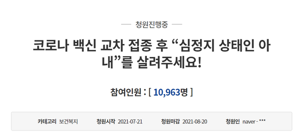 청원인 남편 성도는 “아내가 6월 말 아스트라제네카(AZ) 백신을 1차 접종하고, 지난 6일 화이자 백신 2차 교차 접종을 한 뒤 심정지 상태로 중환자실에서 사경을 헤매고 있다”며 “아내는 올해 48세로 기저 질환도 전혀 없었던 건강한 삶을 살아왔기에 더 더욱 난감하다”고 밝혔다.