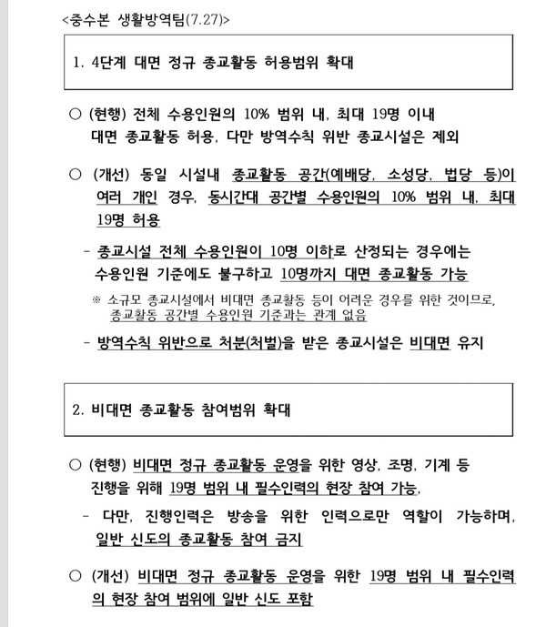 ○ 비대면 종교활동이 원칙임에도 행정법원 판결에 따라 한시적 조치로 수용인원의 10%, 최대 19명까지 대면 종교활동을 허용 중이나, 시설 규모에 따른 차등을 두지 않아 형평성 문제가 있다는 점을 고려한 것이다.