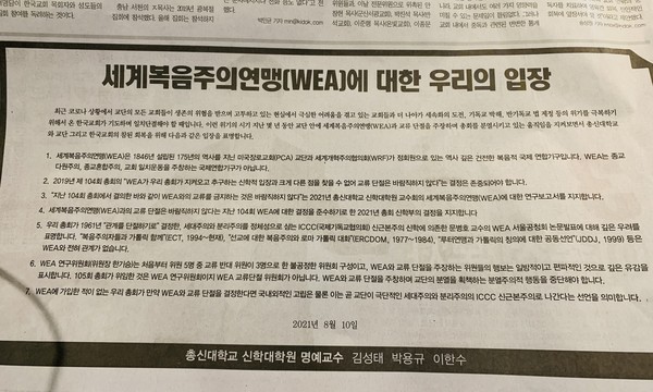지난 2021년 8월 10일자로 기독신문 광고란에 총신대학교 신학대학원 은퇴교수 3인, 김성태, 박용규, 이한수는 “세계복음주의연맹(WEA)에 대한 우리의 입장”이란 내용을 광고하였다.