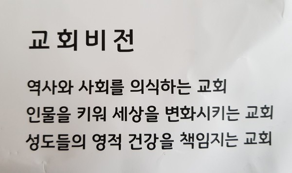 또한 비전 가운데 하나가 "역사와 사회를 의식하는 교회"라는데 또 한번 놀랐다. 예장합동교단 소속교회 가운데 "역사와 사회"라는 용어를 사용하는 교회는 처음이 아닐까? 한국갤럽이 지난 5월 20일 발표한 한국인의 종교에 관한 조사에서, 비종교인 중 개신교에 호감을 느끼고 있는 이들은 6%에 불과했다. 아울러 호감이 가는 종교가 없다고 답한 사람은 61%였고, 종교가 사회에 도움을 주지 않는다고 응답한 사람은 82%였다.