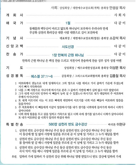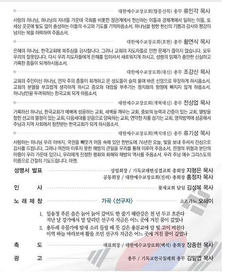 존경하고 사랑하는 한국교회 목회자들과 성도 여러분, 다시 신발끈을 동여매고 완전한 해방의 길을 향해 걸어갑시다. 위대한 조국 대한민국과 한민족을 가슴에 품고 함께 걸어갑시다. 한국교회의 선교와 영적 부흥을 위해서, 나라와 민족의 위대한 부흥을 위해 함께 헌신합시다. 그리하여 우리 시대에 피 흘림이 없는 복음적 평화통일의 꽃길을 열어갑시다. 우리의 땅 한반도에 평화의 성막이 드리워지도록, 함께 기도하며 헌신해 나갑시다. 할렐루야.