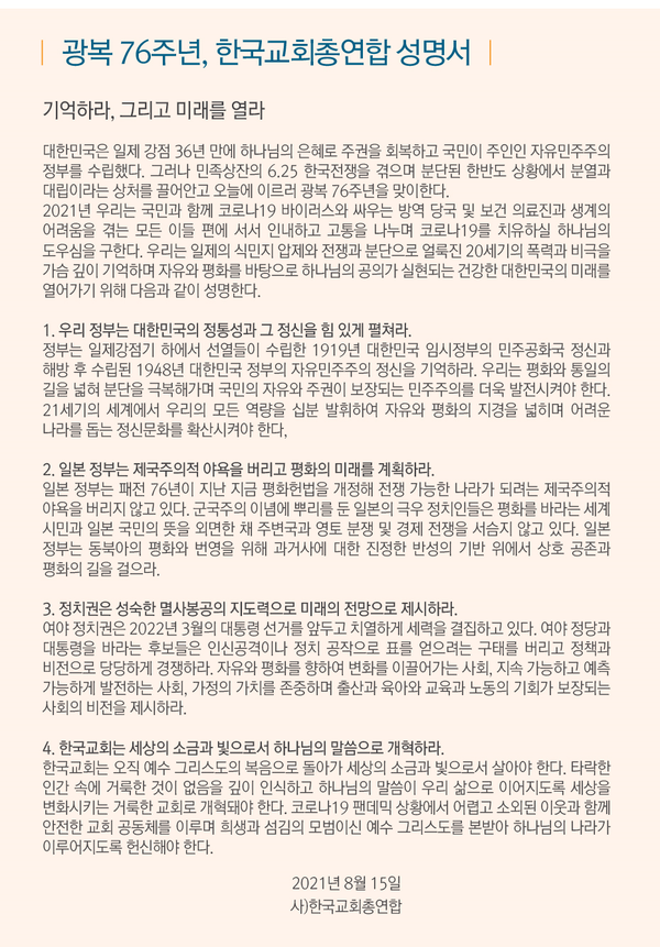 오늘 우리는 광복 76주년을 맞이하여 한국교회 기념예배를 드리게 하신 하나님께 감사와 영광을 올려 드립니다. 1945년 8월 15일, 우리 민족 해방의 날은 일본의 민족말살정책으로 일관한 폭압을 이겨낸 우리 민족의 위대한 쾌거였습니다.