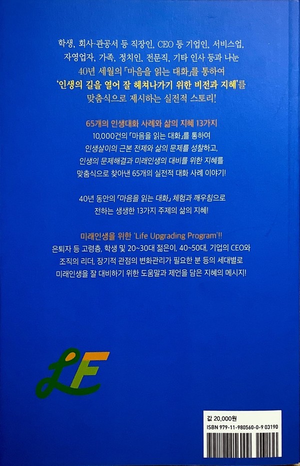 저자는 학생, 회사·관공서 등 직장인, CEO 등 기업인, 서비스업, 자영업자, 가족, 정치인, 전문직, 기타 인사 등과 10,000건 이상의 ‘마음을 읽는 대화’를 통하여 각자의 인생살이의 근본 전제와 삶의 문제를 성찰하고, 인생의 문제해결과 미래인생의 대비를 위한 지혜를 추출하여 65개의 실전 대화 사례로 제시하였다. 또한 40년 동안의 ‘마음을 읽는 대화’의 체험과 깨우침으로 전하는 생생한 13가지 주제의 삶의 지혜를 정리하였다.